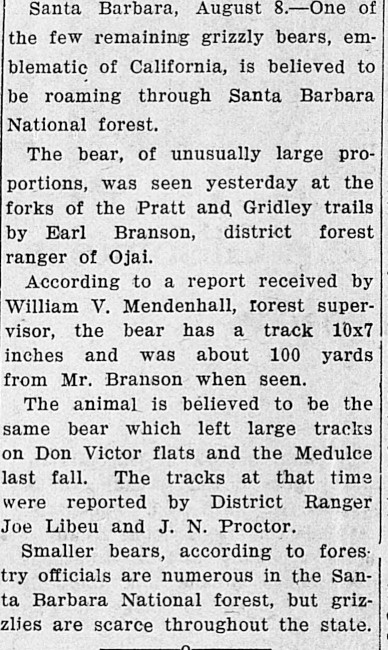This appeared in the Lompoc newspaper on that date because a third district ranger had just reported actually seeing a grizzly in the Ventura County mountains above Ojai.