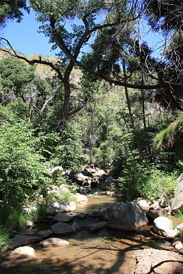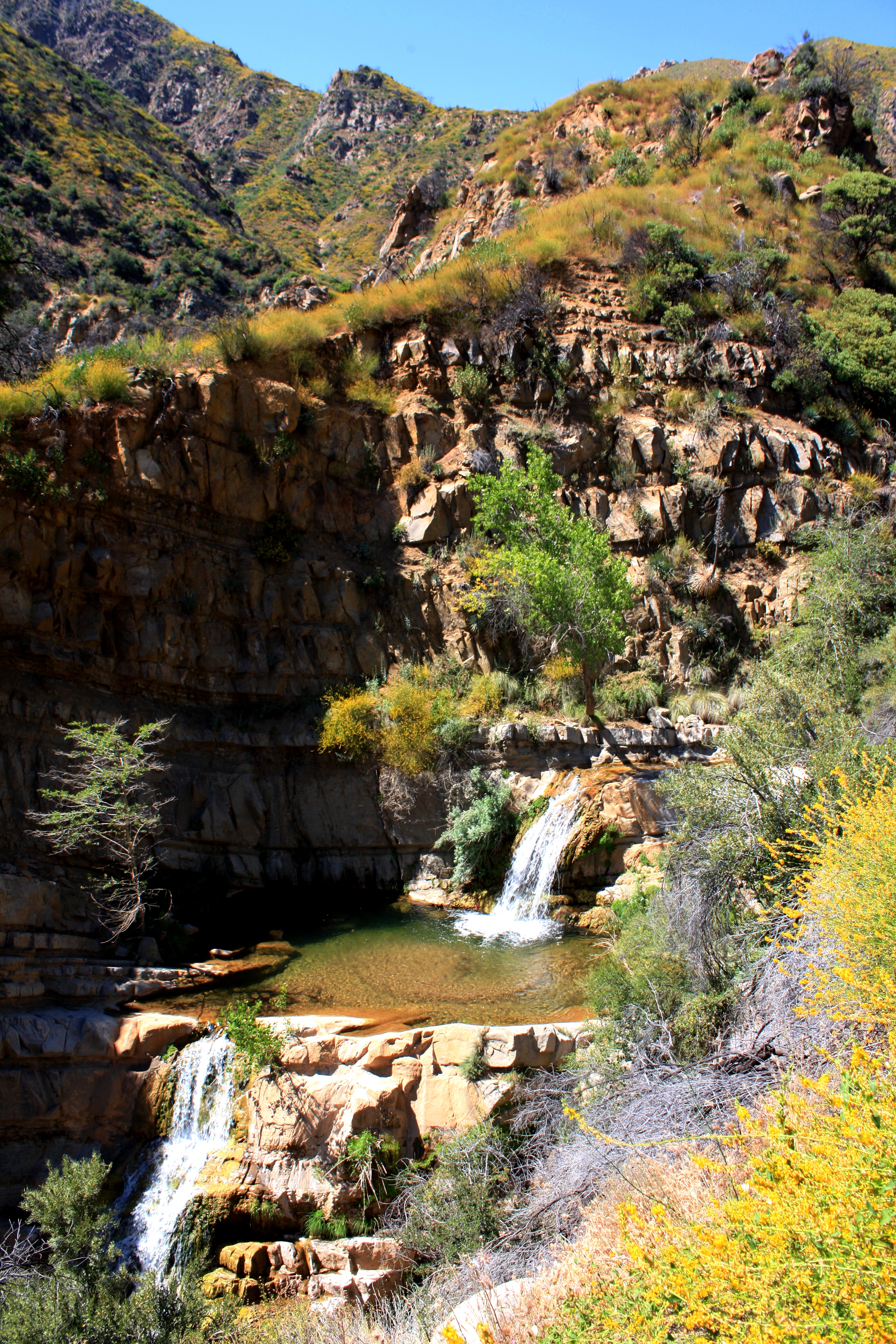 After setting up camp I hiked up to the waterfalls for the day. It was hot in the sun, but walking through the creek kept me nice and cool making for a relatively easy hike. Erosion from the Zaca Fire in 2007 has filled in the creek with gravel covering the cobblestone in many places and making some sections of the creek easy walking. The surrounding mountains are still pretty barren, but the creek is shrouded in a lush, verdant tangle of vegetation.