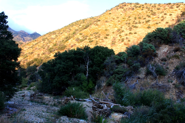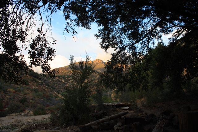 The trail leaves HWY-33 plunging instantly into the spectacular gorge cut through the rugged and rocky pine studded terrain by Potrero John Creek. On the other side of the gorge, it opens up into a fairly wide open wash-type expanse created by the torrential runoff that drains into Potrero John Creek from the Pine Mountain watershed, which is formed by Reyes Peak (7514) to the west and Haddock Mountain (7361) to the east. Potrero John Camp is set beside the creek beneath these mountains.