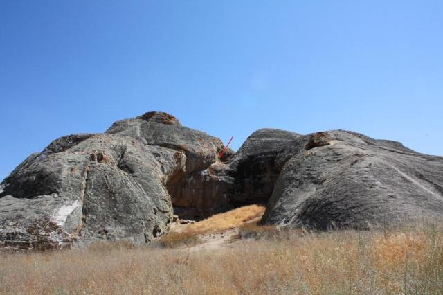 The red arrow points down to where the pictograph is located on the Painted Rock monolith on the Carrizo Plain.