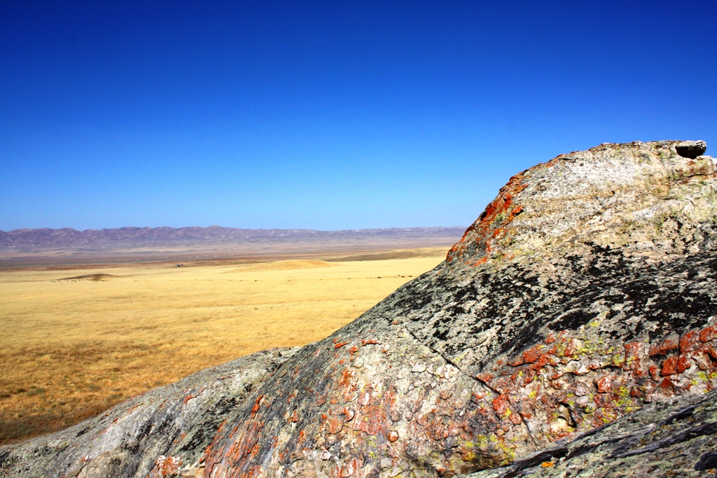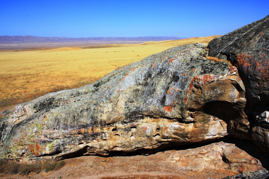 The multi-colored lichen covered rock face with the pictograph to the lower right of the darkened hole in the center of the frame. The banner image was cropped from this photo.