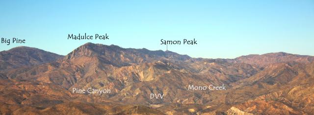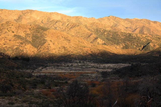 A late afternoon view of Don Victor Valley seen from Pine Canyon. The oak trees in the previous photo can be seen here on the left in the shadow just beneath where the sun is striking the mountain.