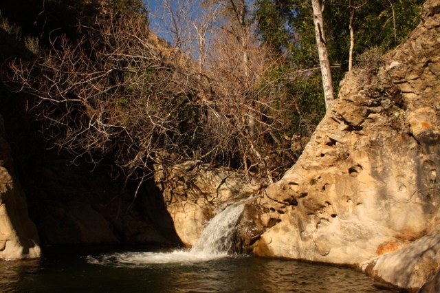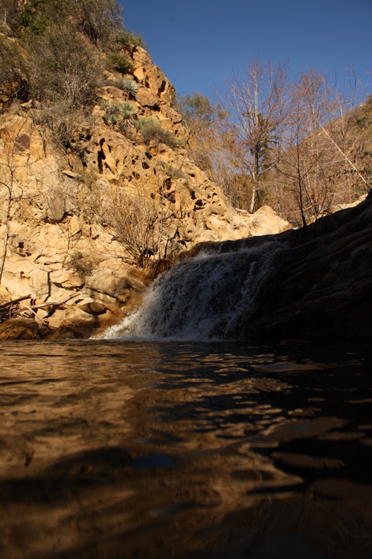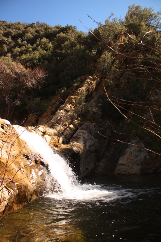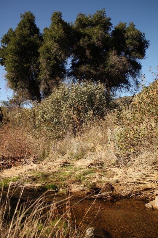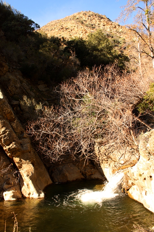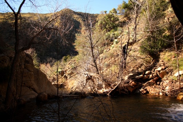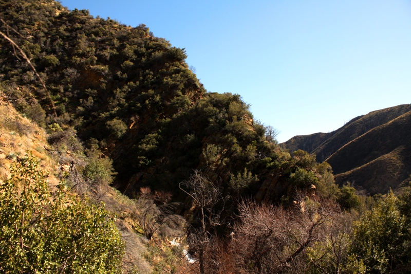 On my way upstream along the overgrown fire road, I stopped to take a look at some rocks embedded in the cliff above Mono Creek. Just then I heard a squeak and turned to see a hawk soaring toward me. I missed seeing the hawk snatch up its mid-afternoon meal by mere seconds, but it circled directly overhead twice, obviously curious about my presence, and the way I must have stuck out in the desolate valley. And rather than some type of rodent damned if it didn’t have a bird clenched in its talons.