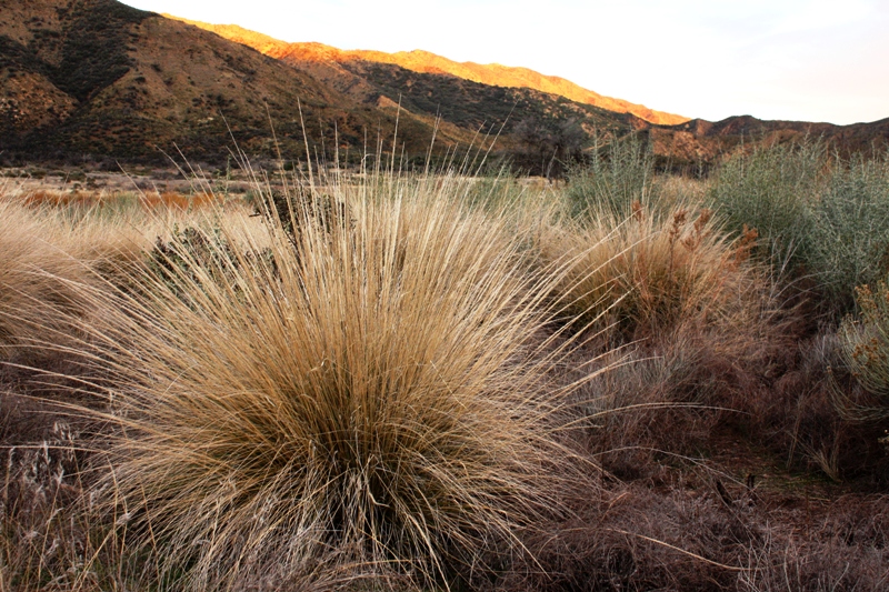 At the mouth of Pine Canyon, there is a patch of huge tufted grass with some clumps growing three feet tall or more. They are an interesting feature of the landscape, as far as grass goes.