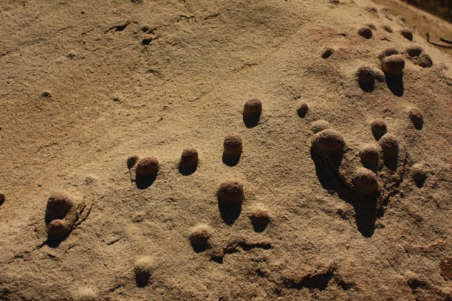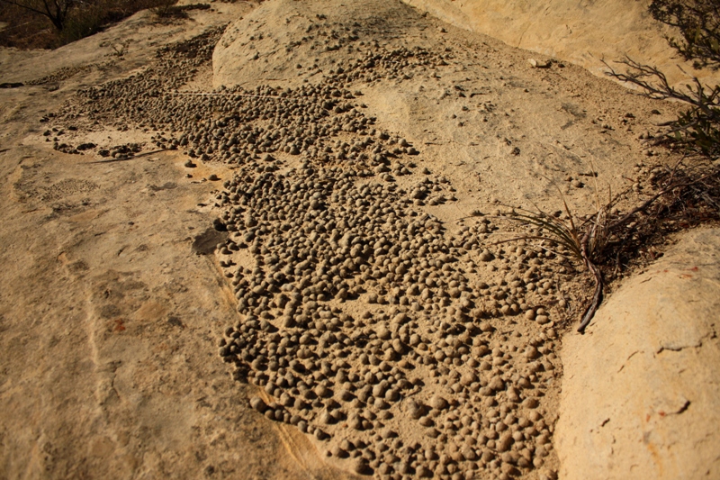 The wind is scouring out these roundish little balls of stone from the larger sandstone bedrock formations. These naturally carved marble-like pellets have been eroded free from their lithic encasement and blown together by the hundreds in some places. Elsewhere they are still connected to the bedrock, some nearly freed and others just a bump starting to emerge.