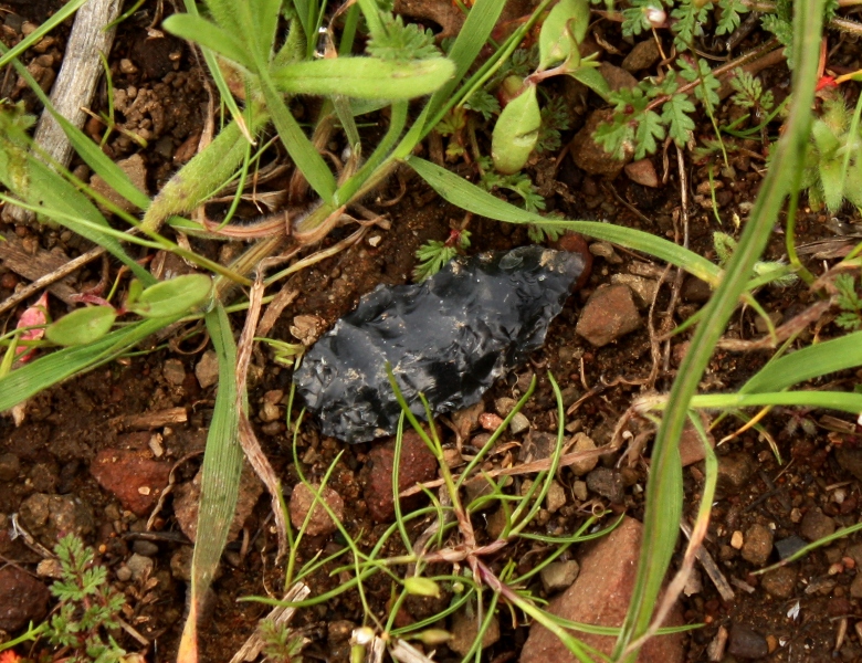 Right on the trail, in the weeds that have been clipped short by constant foot travel, just inches from the bare dirt path itself, laid an inch long obsidian arrowhead. It had been cleaned of dirt from the rain and was lying there as if somebody had set it down.