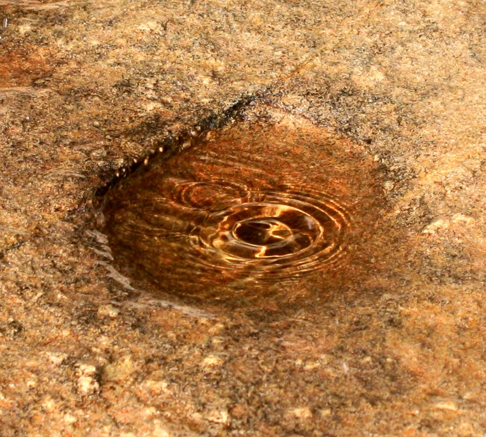 A drip drop divot under the falls. How long does it take for single drops of water to wear such a depression in the sandstone?