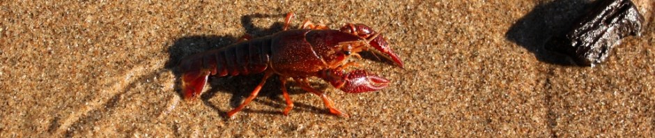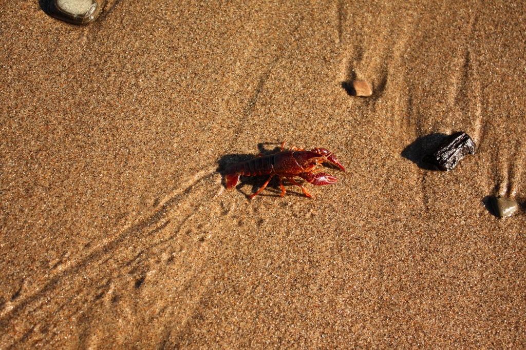 I only saw two lobsters, but there were nearly as many crawdads all up and down the beach as there were dead crabs and many of them were still alive. Somehow they had survived being washed out into the ocean, tumbled through the stormy surf and then pushed ashore at high tide. They were crawling back to the sea along the sand flats at low tide as if headed to a river. They looked like baby Maine lobsters.