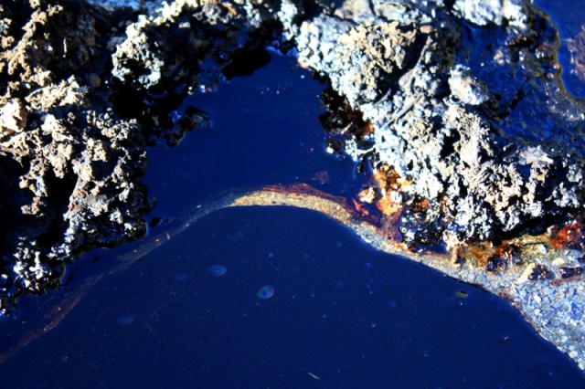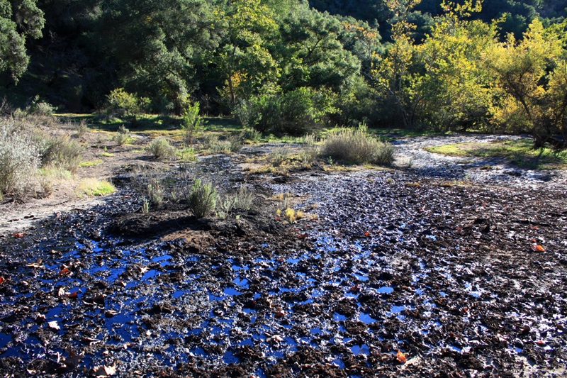 Oil headed toward the creek. Liquid, and freely flowing, it reflects blue from the clear skies overhead. This photo was taken in early fall prior to seasonal rains. What looks like mud is a result of the oil.