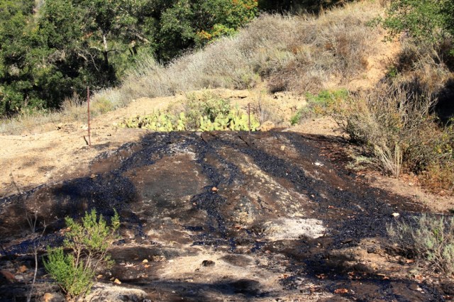 Gilbert’s operation was located somewhere near Rancho Arnaz, which is not a very far walk from where the Sulfur Mountain site noted here is found. At the seep there is no trace of industry infrastructure or equipment that suggests it is the result of a well that was drilled and improperly capped, although that very well may be the case. The earth has been moved and mounded up somewhat around where the oil emerges from the ground, but that is about the only trace of prior activity at the site aside from barbed wire fencing.