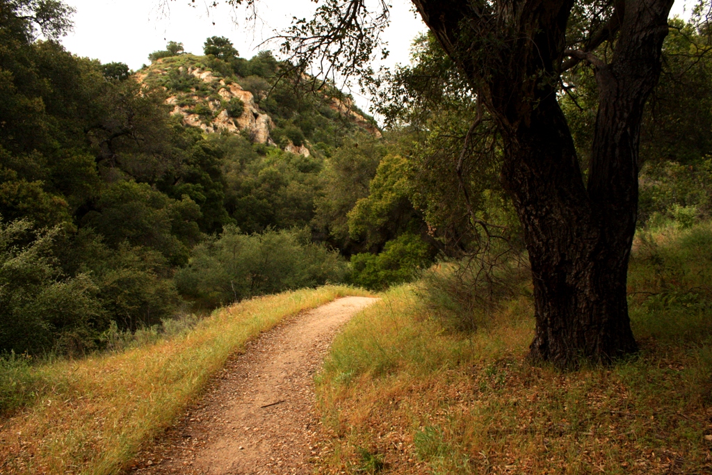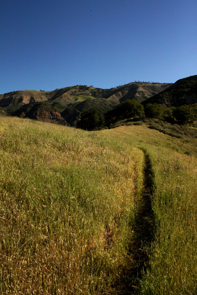In one of the actual mudslide areas, standing at the edge of the trail, I could see the lost section of footpath twenty yards down slope running through the grass in a patch of earth that had remained intact during the slide. A thin stream of water was running through the muddy slop and I could hear it trickling somewhere nearby. It sounded like it was falling underground, inside a deep enclosed pocket or hollow cavity. I carefully found my way over the unstable ground hoping not to fall into a muddy chasm or step in a sloppy soft spot.