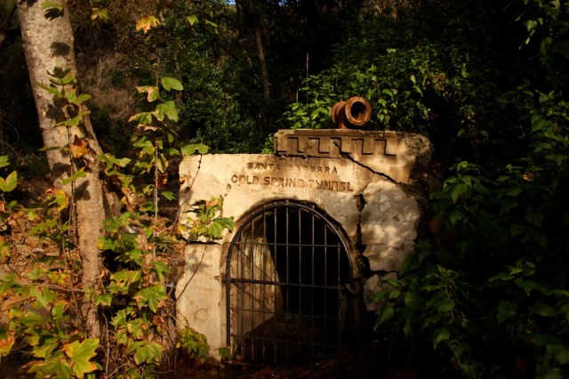 On the west fork of Cold Springs Creek in the mountains behind Montecito, near where the trail leading down from Gibraltar Road crosses the creek there, the old Cold Spring Tunnel can be seen. It was Santa Barbara’s first municipal or city-owned water supply and its successful completion led to the construction of Mission Tunnel, which delivers water through the Santa Ynez Mountains from Gibraltar Reservoir. The tunnel marks a crucial point of progress in Santa Barbara’s history.