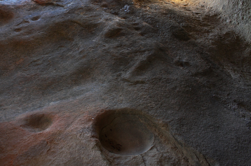 I intended to hike up the canyon to Munson Spring, but a rather dense bramble of wild rose eventually forced me to turn around. My thin nylon hiking pants were no match for all the tiny thorns and my legs were getting shredded. Which wouldn’t have stopped me short normally, but I wasn’t in the mood that day for serving as a pin cushion or bushwhacking and lacerations. So on the way back down creek I wandered over to this rock formation that caught my eye on the hike up. It was filled with holes like Swiss cheese and I had noticed a cave that had looked large enough to crawl inside. Upon entering the small sandstone hollow I found a bedrock mortar.