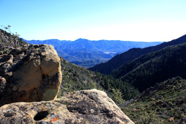 I spent my days lounging around reading at my makeshift Rancho Relaxo and hiking around the basin to see what I might see. I walked up the slope south of the camp and to the crest of the hill, which afforded me a spectacular view overlooking Sespe Creek and the Piedra Blanca trailhead area. I found a hole in the well weathered sandstone up there that looked to me to be an Indian grinding stone.