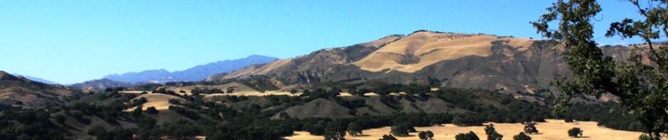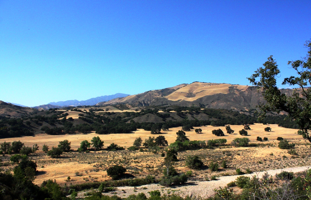 The grassy slope of Loma Alta mountain seen here, Figueroa Mountain visible in the distance to the left and a dry section of the Santa Ynez River at bottom.