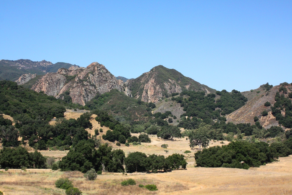 Overlooking Malibu Creek winding through the grassy valley with the Goat Buttes outcrop rising beyond. The creek flows through the gorge between the two peaks, where a dam was built long ago creating a small lake.