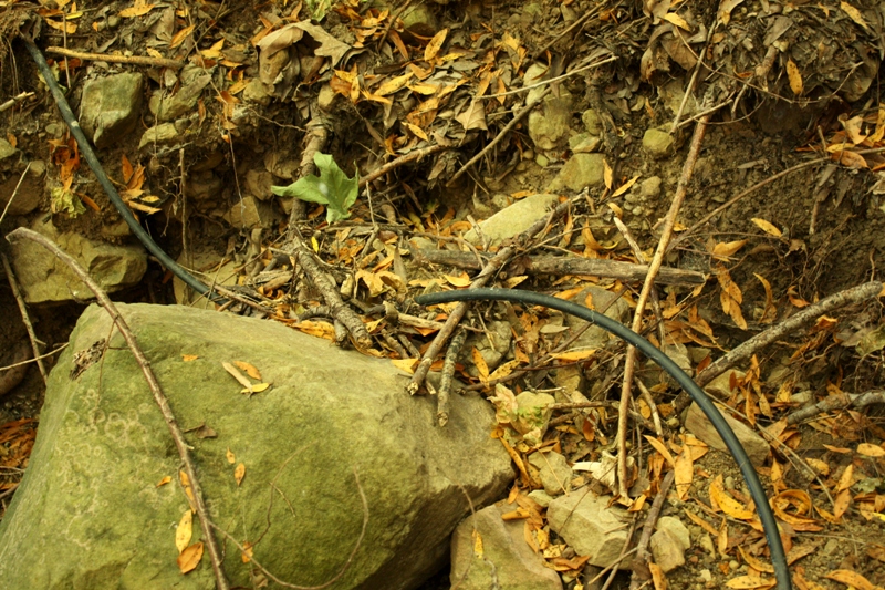 I saw this sort of plastic irrigation tubing in several places. Marijuana growers will set one end in the creek concealed by rocks and with a screen of some sort to filter out debris. The line is then run slowly up out of the creek down canyon, buried beneath dirt and leaves, and to the grow site, where it waters the plants through the natural force of gravity or fills reservoirs.