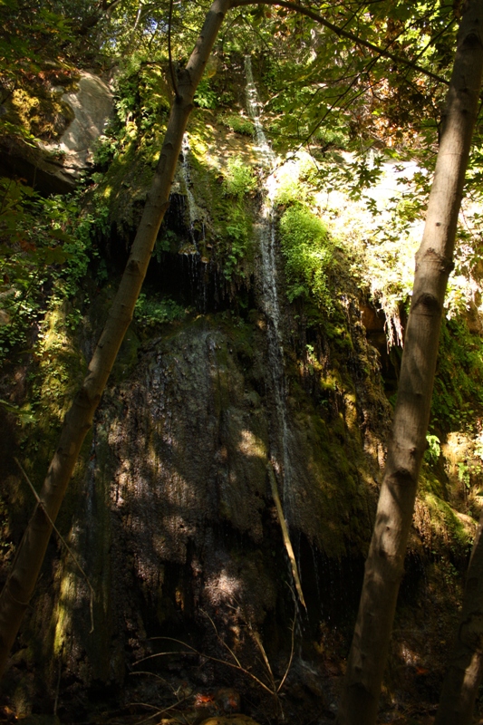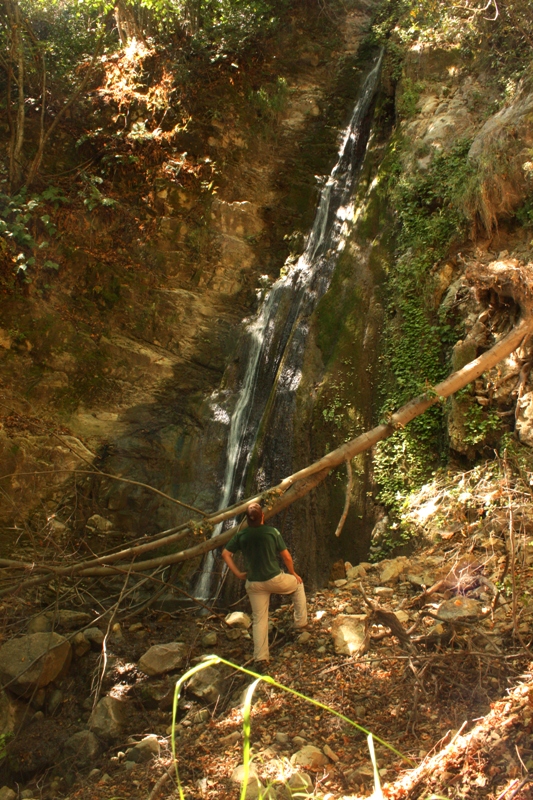The route looked promising and I eagerly started following it. There was evidence of its use by others, but it was quickly consumed in old growth chaparral and apparent that it was obviously not routinely traveled. I pressed on nonetheless thinking it was, indeed, an old route to the falls, though all evidence of use quickly disappeared altogether. I believe it is the old road cut made by George Owen Knapp, which led to the bathhouse he purportedly built in the canyon somewhere near the waterfall.