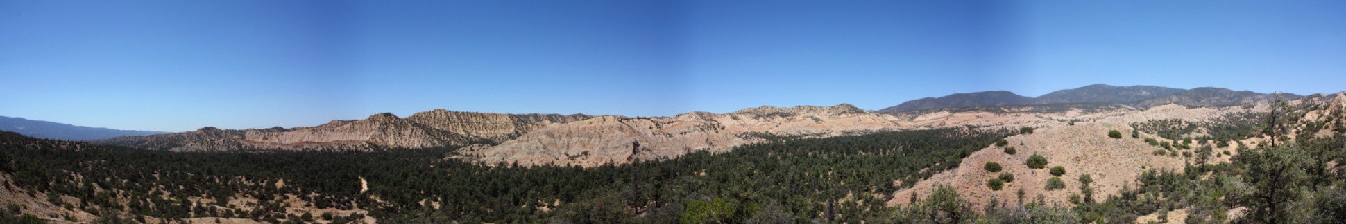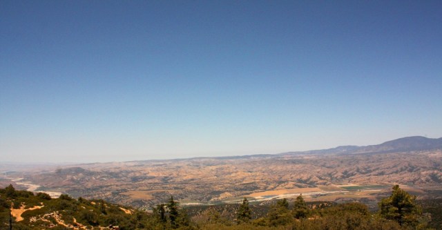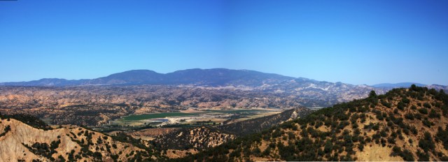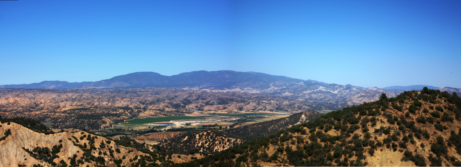Panorama view (click to enlarge) of Cuyama badlands from Highway-33 on the north slope of Pine Mountain. Mount Abel, Sawmill Mountain and Mount Pinos are seen in the distance. (August 2011)