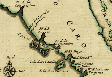 A detail showing the “Canal of Santa Barbara” as thought to exist in 1705. It was a place name later mentioned by Richard Henry Dana, Jr. in 1835. Today it is better known as the Santa Barbara Channel.
