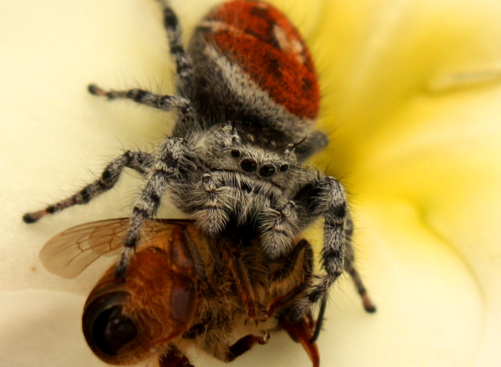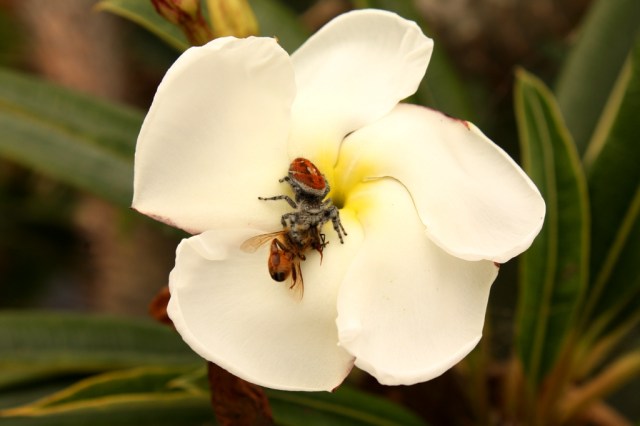 I noticed in my garden this afternoon that a jumping spider had caught a bee while waiting on the flower of a Pachypodium lamerei.