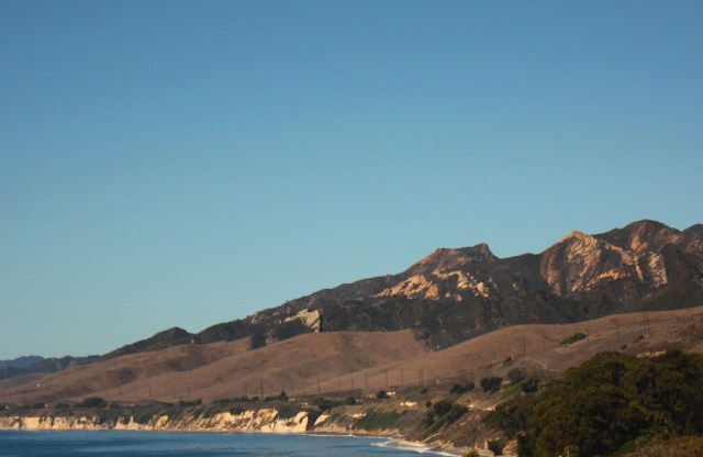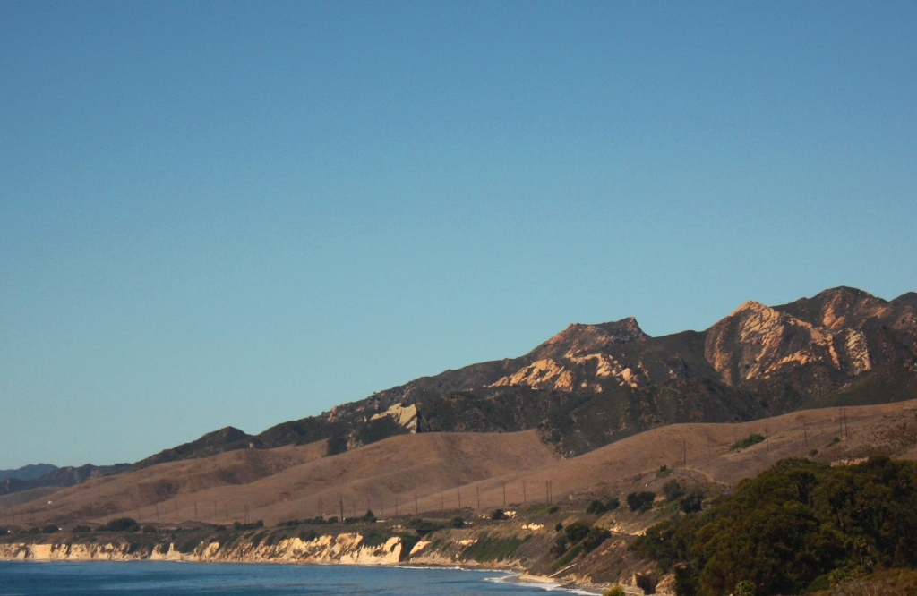 A view of the Gaviota Coast and the south slope of the Santa Ynez Mountains showing the sharp contrast between grassy rolling hills and chaparral covered rocky peaks.