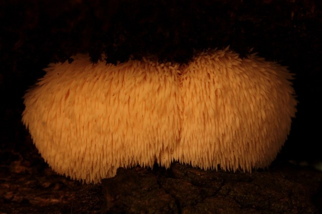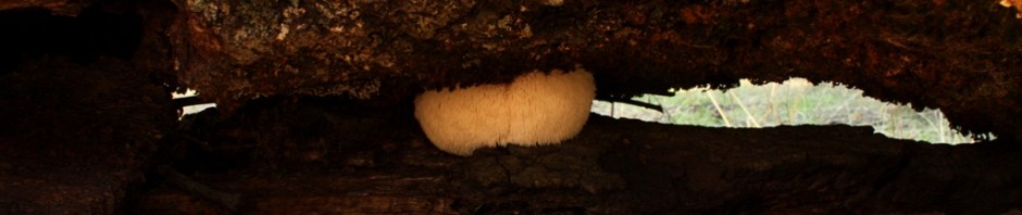 I happened across this Hericium erinaceus (bearded tooth, lion’s mane, pom pom) a few days ago. It was late afternoon and after walking a few miles down the trail I was looking for a place to sit and eat a snack. I found my way to the edge of a clearing and was meandering around the tangled branches of a downed oak tree at the fringe of the forest line. I wanted somewhere to rest that was out of the open, but where I could keep an eye on things. As I bent down to sit on a section of the old oak I noticed the snow white mushroom gleaming from the shade between the moist, dark logs. I was lucky, it was young and fresh so I sliced it free and took it home. When fried in butter the meaty mushroom steaks roast up golden brown and have an exceptional flavor that can taste sort of like crab or lobster.