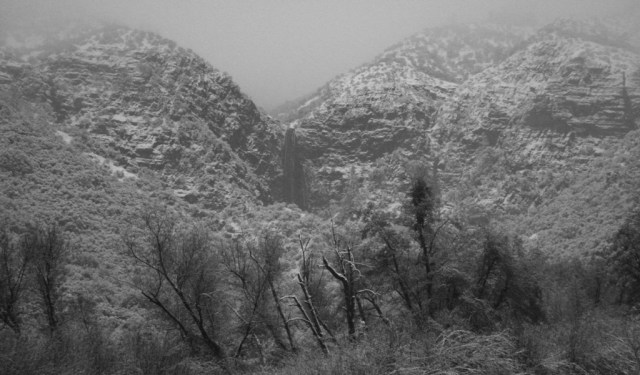 The typically ephemeral and lackluster waterfall at Rose Valley Campground in Ventura County seen here, center frame, as a mere vertical blackened bare spot lost amidst the more eye catching snow-frosted mountain.
