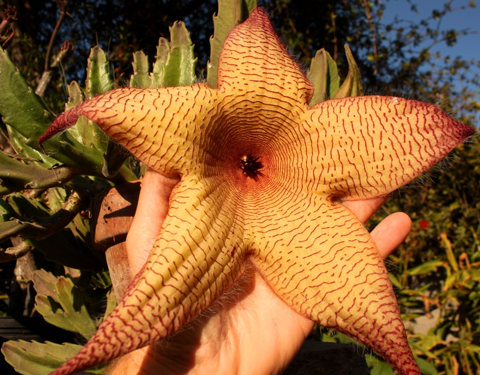The plant shown here started as a small finger length cutting that I took while on a hike on Oahu. Clumps of Stapelia were growing everywhere along a rocky wind swept ridge, although it’s not native to the island. This is the first flower since I rooted the cutting.