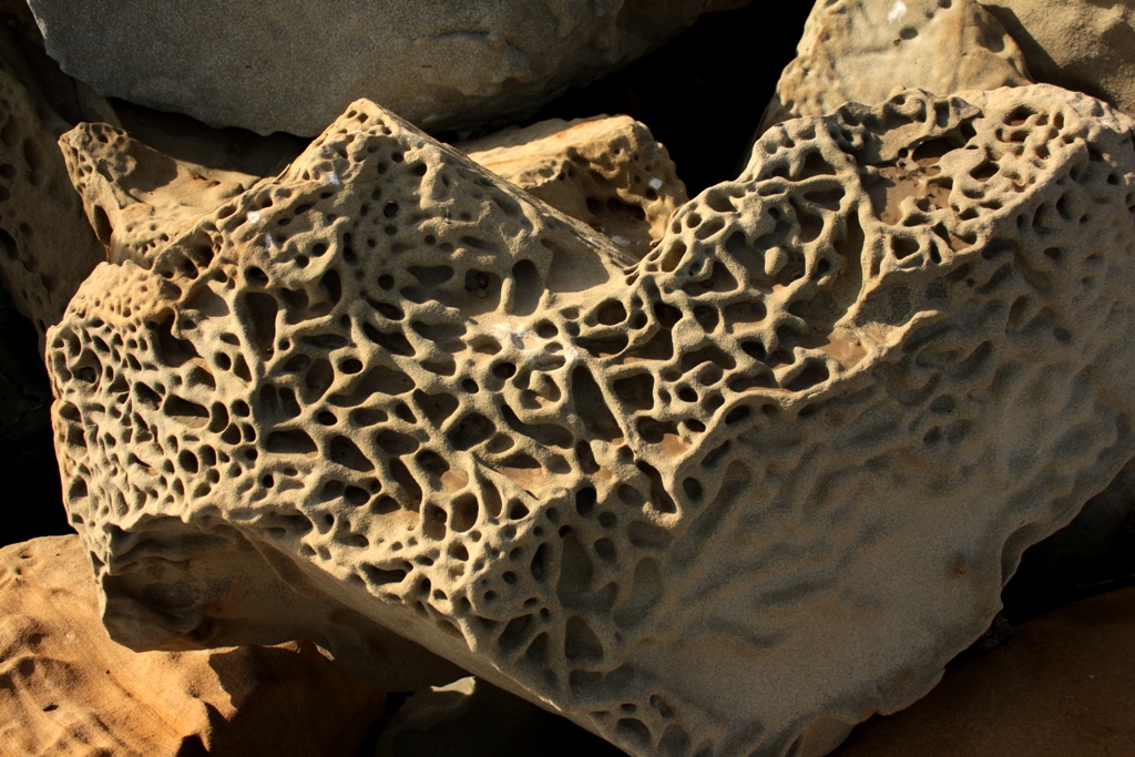 “Tafoni are ellipsoidal, pan- to bowl-shaped, natural rock cavities. These cavernous weathering features include tiny pits, softball-sized cavities, truck-sized caves, and nested and cellular honeycomb forms. Tafoni typically develop on inclined or vertical surfaces and occur in groups. These exquisite and fascinating cavernous weathering landforms are present on the surfaces of many different kinds of rocks located in a multitude of geographic regions around the world.”