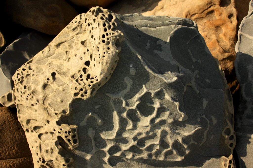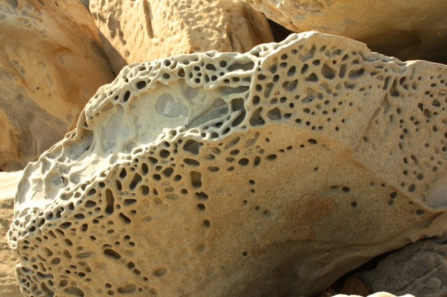 A two-tone beach boulder in northern Ventura County with tafoni forming along its edge.