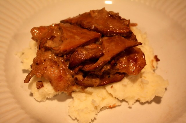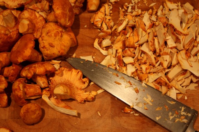 Chicken and chanterelles in a Madeira wine butter-cream sauce. I came up short in extra sauce; a ladle full over the top of everything would have been good.