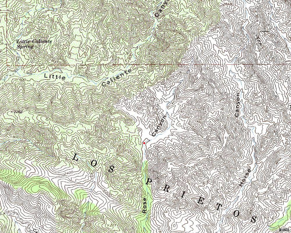 A USGS map showing Rose Canyon. The red dot notes the location where the video was taken from.