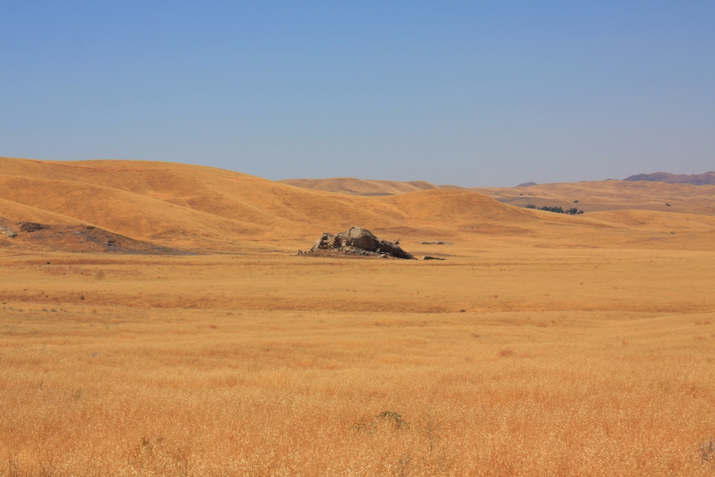 Then, finally, the grayish mounded form of Painted Rock emerged from the grassland far off toward the base of the Caliente Range. That is how the monolith so lavished with attention from humanity since ancient times appears to modern day visitors as they approach. Though set in an open expanse of treeless terrain in a landscape of few rocks, it is tucked within the rumples of the land and somewhat hidden from view.