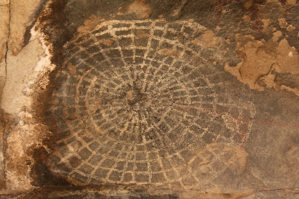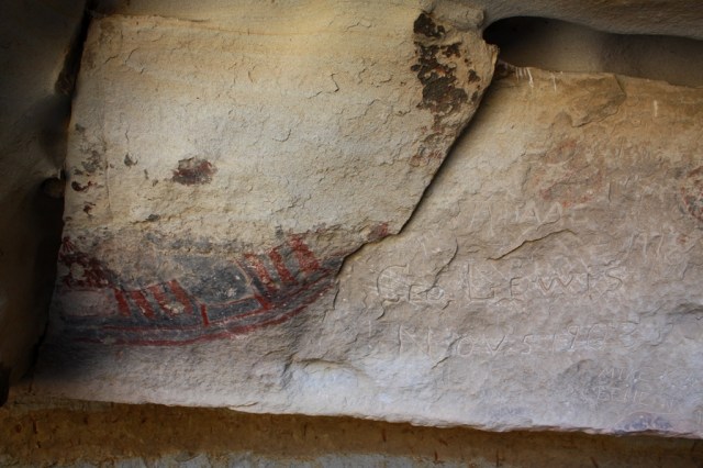 A badly eroded rock art panel showing natural sandstone exfoliation. Look closely to the right of the rock art and the name “Geo Lewis Nov 5, 1903” can be seen carved into the stone.