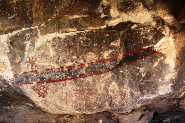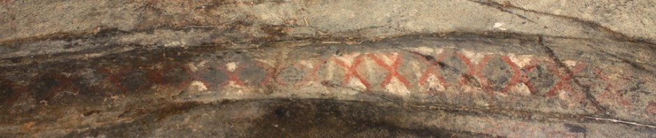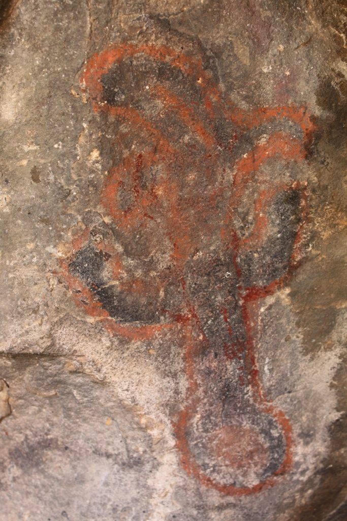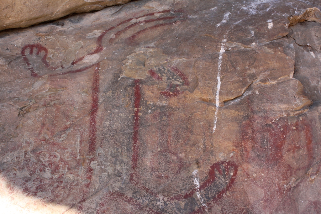 A view of the interior wall that holds or held some of the most notable pictographs. Historically, the rock art panel appears to have span some 30 to 40 feet in length. Following below is a small selection of some of the many pictographs to be found on Painted Rock.