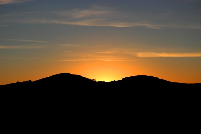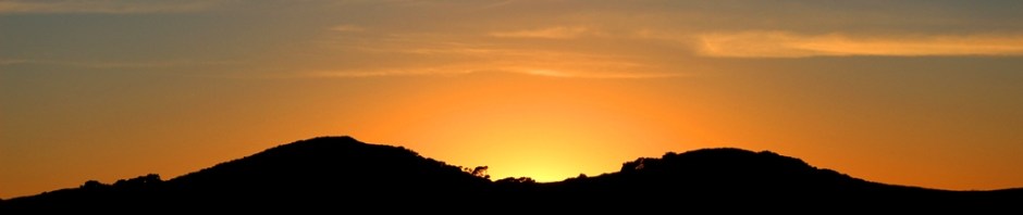 On the way back I paused repeatedly for different lengths of time to rest, look around and enjoy the view; more choices. Then, as I emerged from a stand of oak trees in twilight and came into sloping grassland, the golden glow of sunset drew my eyes toward the west and I stopped. My existence at that moment in space and time, my timing and position in altitude and distance, was near perfect. All choices that day had led me to be standing at that exact spot at the very moment the sun had set right between two rolling hills.