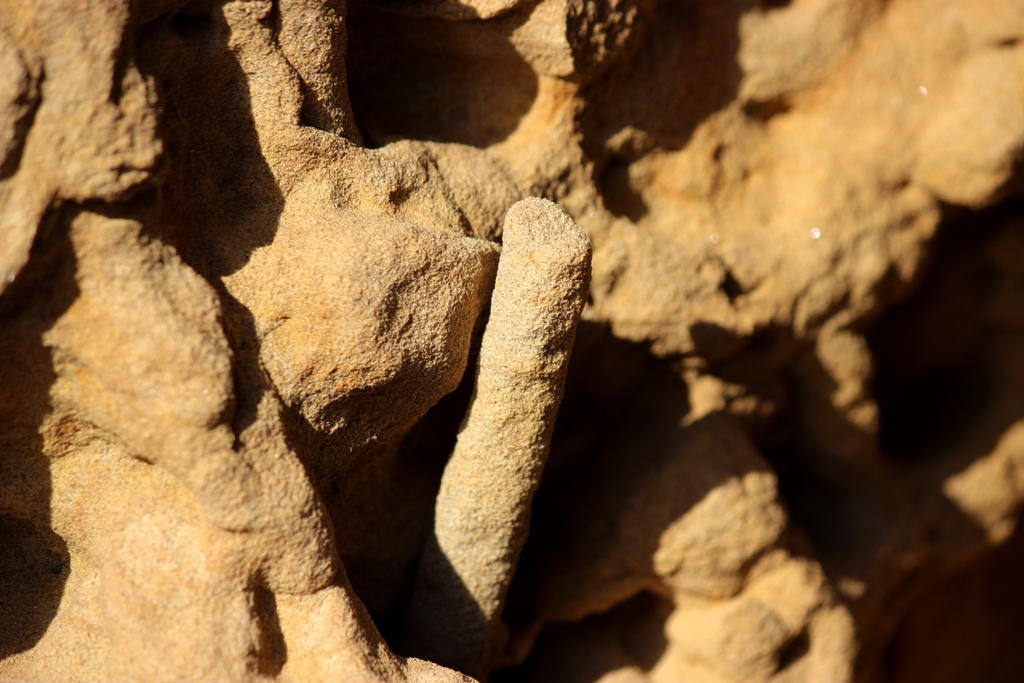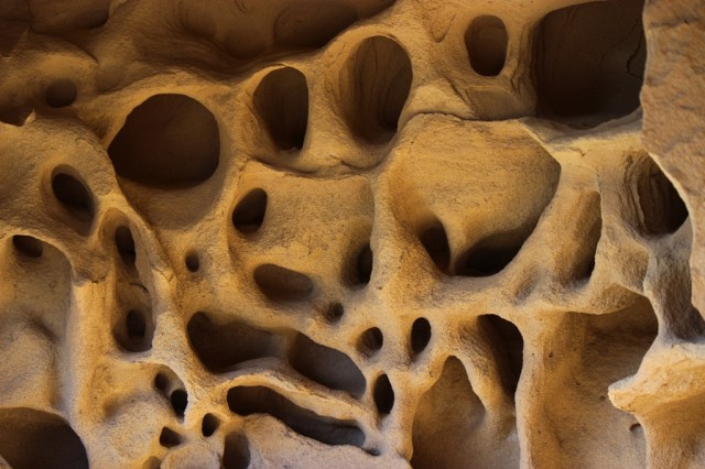 Tafonied sandstone seen in a cave along the trail. More examples of tafoni weathered stone have been previously noted here.