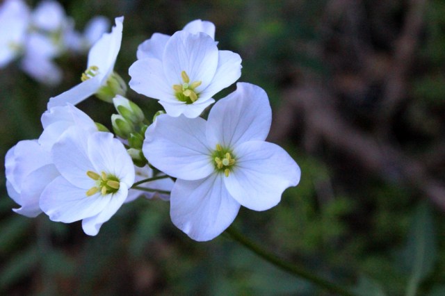 Wildflowers known by the various common names of Milk Maids, Bitter cress and California Toothwort (Cardamine californica).