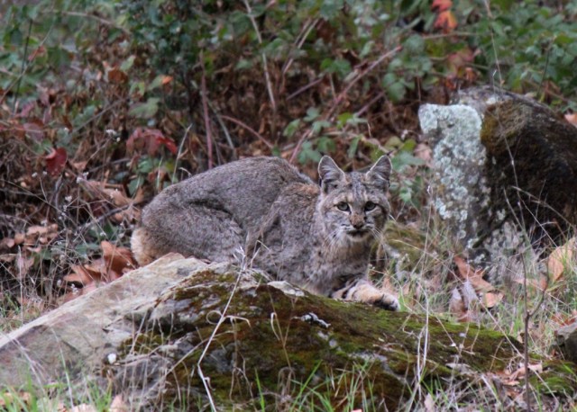 After a rest I left the cave and climbed to the top of the outcrop along its lower most saddle and then scampered on back down the slope to the canyon floor. Walking back up Sulphur Creek toward the trailhead, I crossed paths with another smaller bobcat. I had mistakenly walked off the faint path and been pushing through the bushes when I spotted the cat a short distance away.
