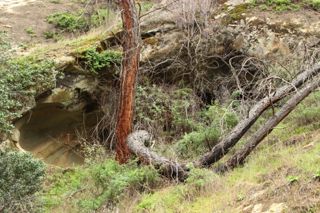 Making my way further up the slope another cave came into view, its mouth hidden behind a shroud of bare poison oak branches. When the poison oak is fully leafed out in summer the cave must be unnoticeable from a distance. As I parted the branches and stepped inside I was surprised to see its size. I couldn’t help but admire what a choice campsite it would make and pondered what I would do to turn it into a cozy dwelling.