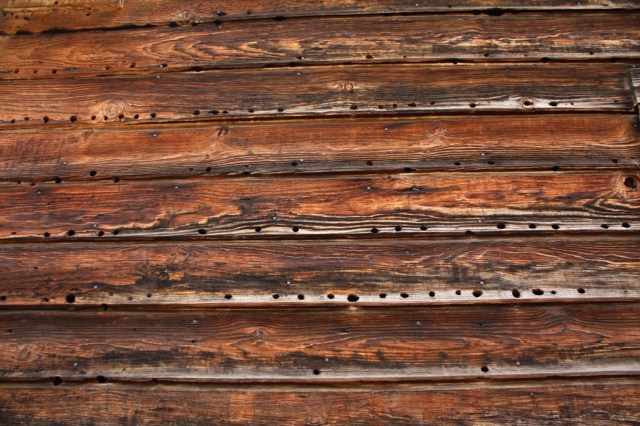 A detail of the pine planks making up the outside walls of the schoolhouse, which are riddled with holes from wood peckers.