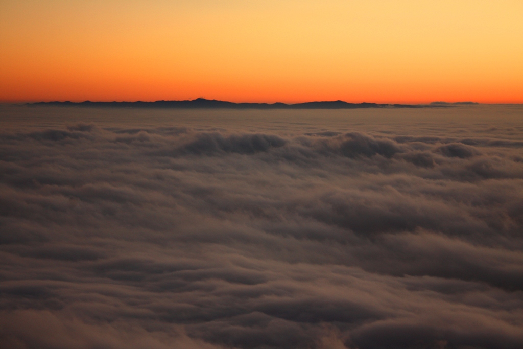 Santa Cruz Island poking through a blanket of fog and into the rutilant winter light, as seen from the Santa Ynez Mountains.