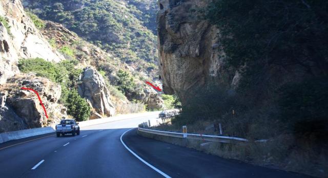 A present day view of Gaviota Pass looking down the southbound lane. The red lines note the same rock formations seen in the previous historic photo.