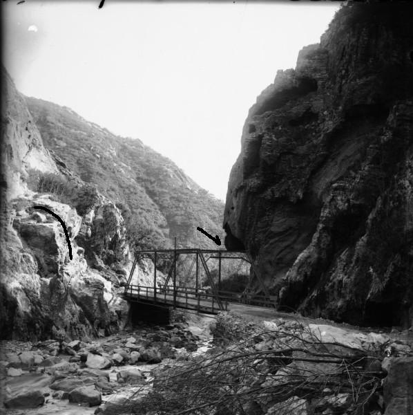 The bridge over Gaviota Creek, Santa Barbara County circa 1900. The two black drawn lines correspond to landscape features still visible today and which are noted on modern day photos shown below. The black arrow on the right points to “Indian Chin.”