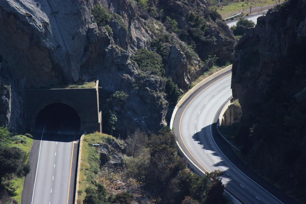A mountainside view of Gaviota Pass, the southbound lane on the right as well as Indian Chin. A smooth and effortless drive today, the pass between the bedrock went from a foot trail, to a rocky dirt stagecoach road through what was then called Las Cruces Creek, which was then spanned by a steel bridge, then paved over in a cement single lane road for cars and finally a divided asphalt highway.