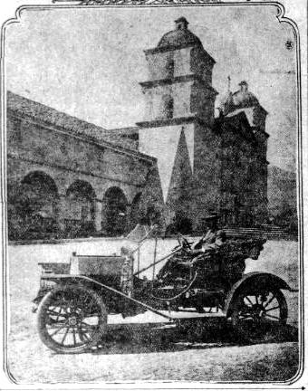 A photo of an early automobile parked in front of the Santa Barbara mission. (San Francisco Call, June 19, 1910)