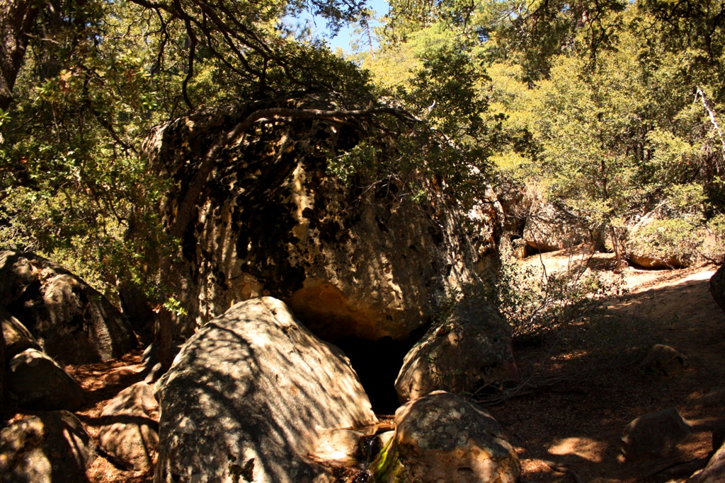 Chorro Spring, as seen in mid-afternoon in May 2011. The water flows out from under the boulder and between the rocks. It is a remarkable spring in the way it flows from under the rock and, for that reason and the surrounding landscape, my favorite seep in the Tri-county region.