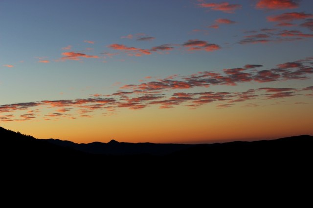 A sunrise view from the south slope of Pine Mountain. The conical point in silhouette is Chief Peak.