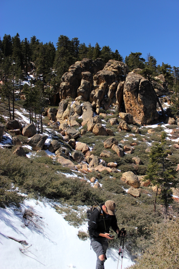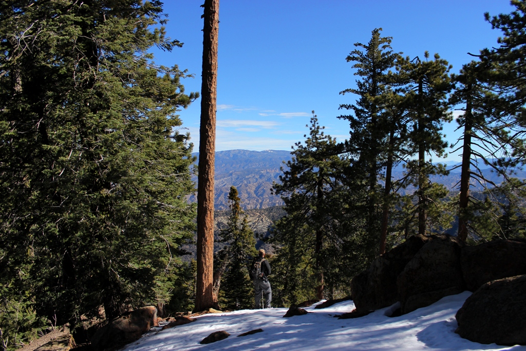 Here and there Stillman took a peek at his GPS to plot our off-trail course between Reyes and Haddock. This was some awesome hiking! No trail as we plodded through snow beneath an azure sky with the low howl of a slight wind blowing through the pine forest, the trees tinged golden orange with early morning light. As “Macho Man” Randy Savage would say, “Can you dig it?” Oh yeah.